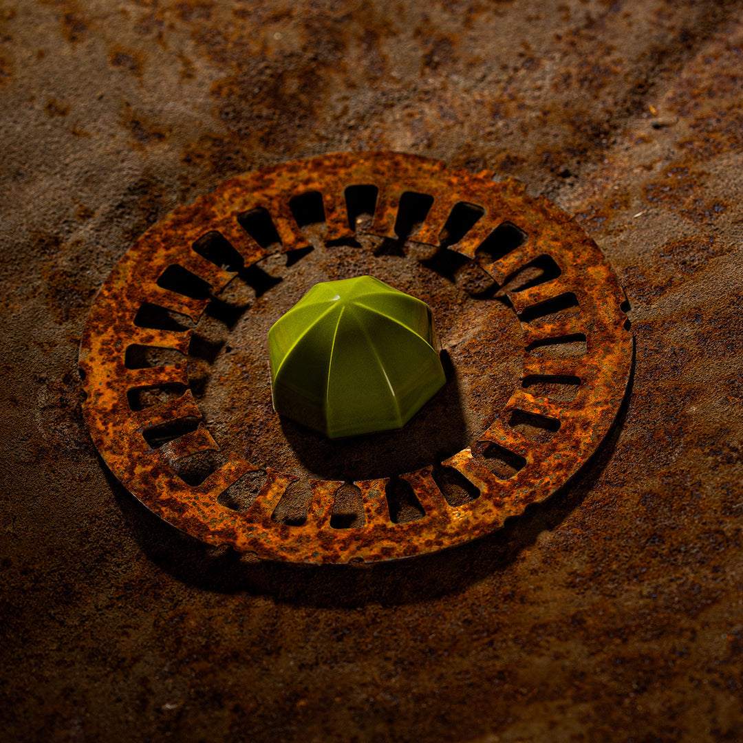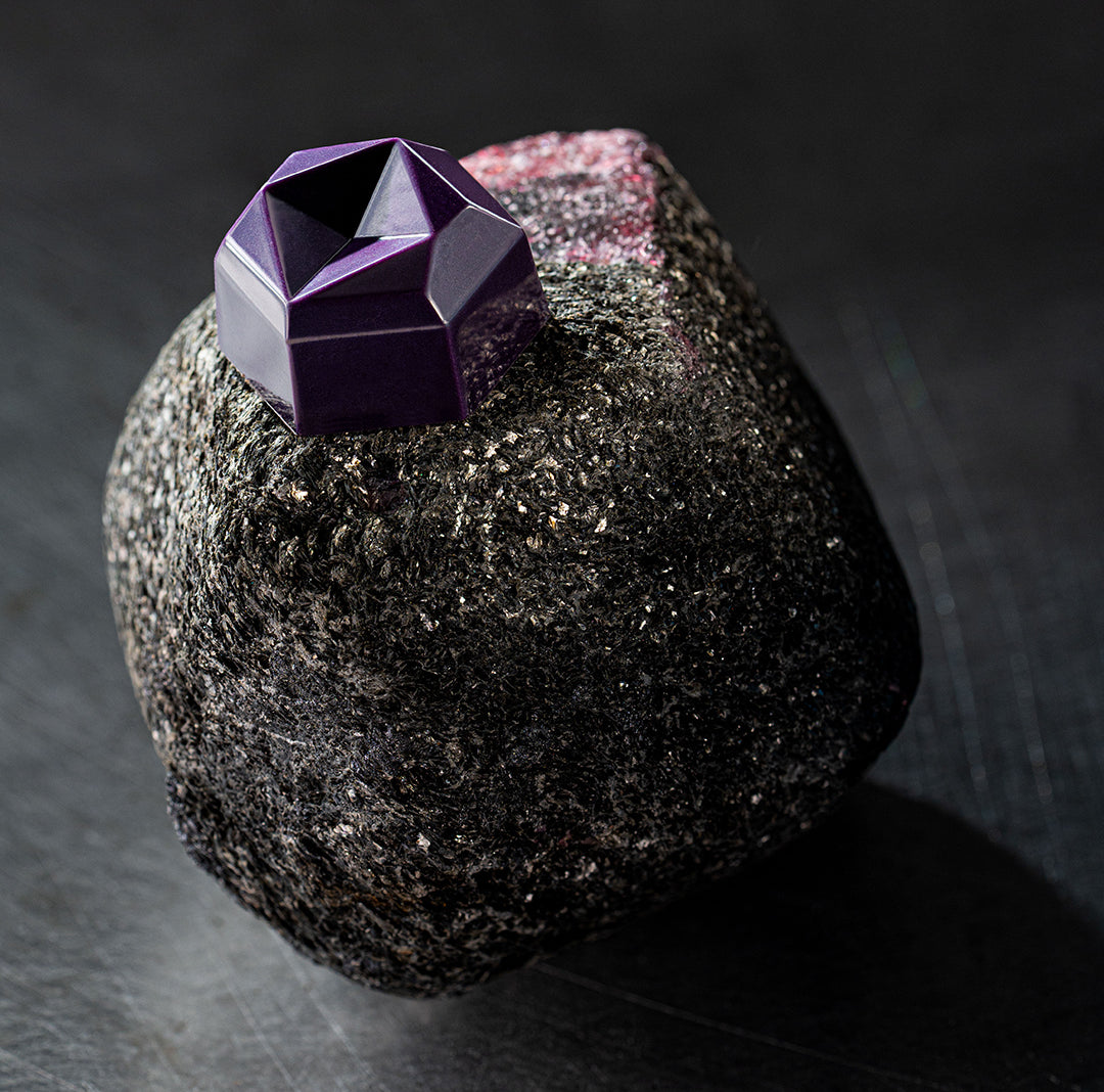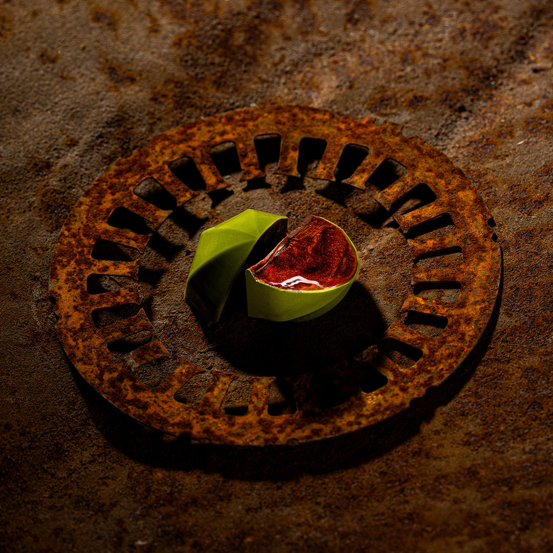 Dark chocolate (70%) and sudachi puree: the Japanese version of lime — deeper and more aromatic. And less. You have Google, look it up.