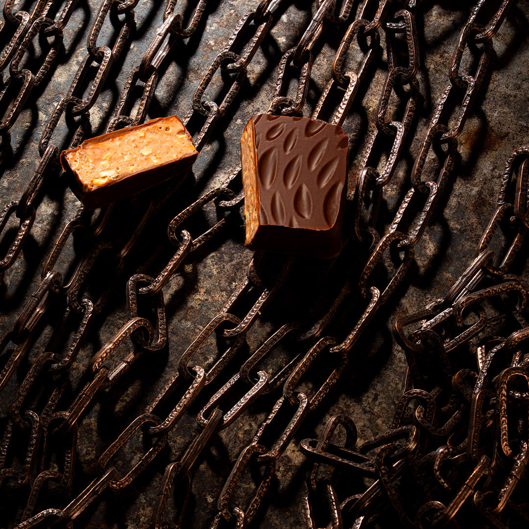 Jelly made from hops that haven't matured enough to become beer, with gianduja, in which we've crushed pretzels. Otherwise, with milk chocolate.